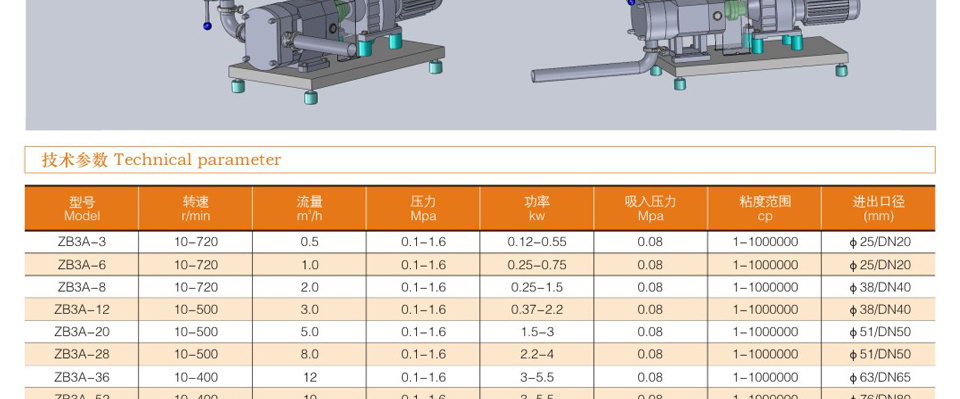 ZB3A系列膠體泵-又稱羅茨泵、不銹鋼轉(zhuǎn)子泵、凸輪泵、萬用輸送泵、酵母泵、蝴蝶泵、三葉泵、鞋底泵、藥料泵、熱溶膠體泵、顆粒膠體泵、渣料泵、蛋白渣泵、高濃漿泵等,依靠兩個同步反轉(zhuǎn)動的轉(zhuǎn)子在旋轉(zhuǎn)過程中于進口處產(chǎn)生吸力(真空度),從而吸入所要輸送的物料。